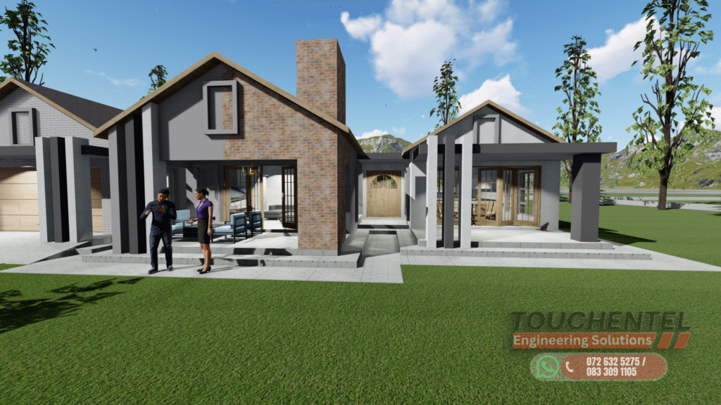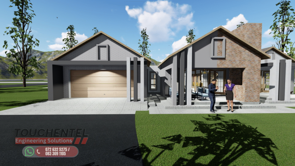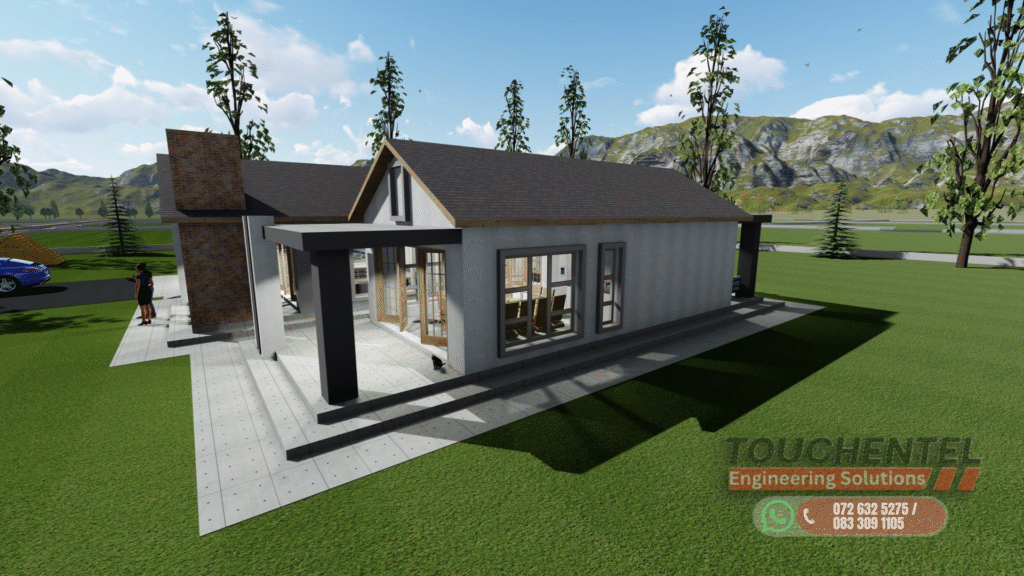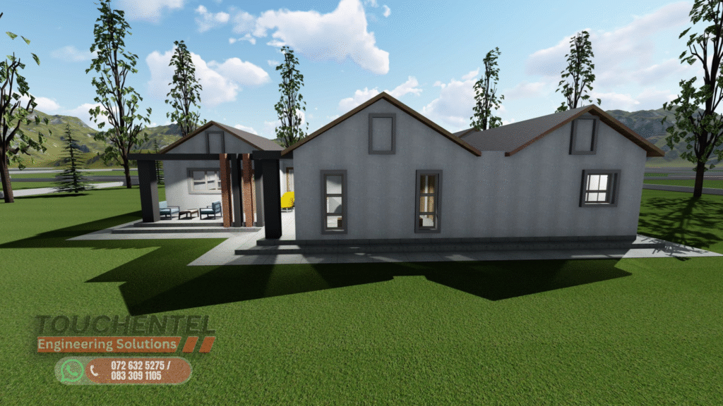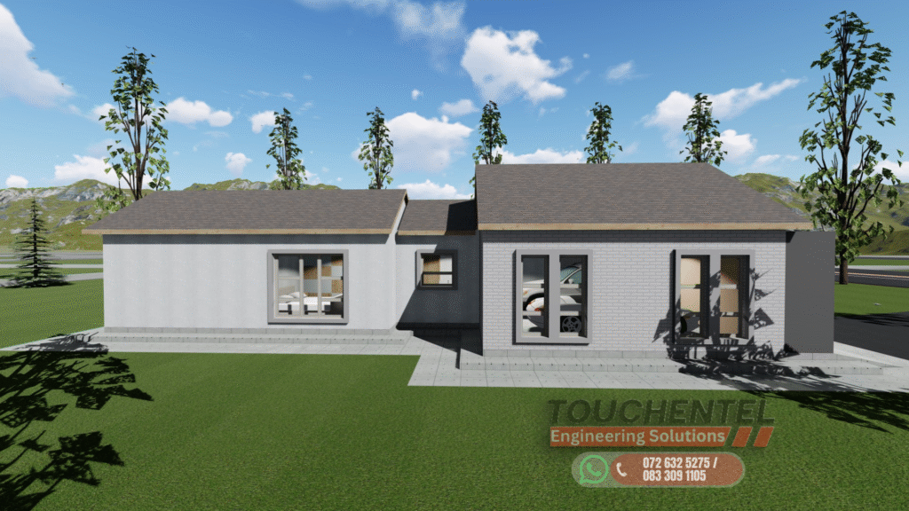 Modern Contemporary Family Home This single-story residence blends modern design with comfort and functionality. Featuring clean lines, varied roof heights, and a mix of face brick, plaster, and painted finishes, the home strikes a balance between elegance and warmth. ExteriorThe façade is carefully proportioned, with a central entrance, garage to the left, and extended living areas to the right. Large windows and sliding doors maximize natural light and create a seamless indoor–outdoor connection. Earthy tones, brick cladding, and pitched gable roofs harmonize the home with its natural surroundings, while verandas and entry steps add depth and character. InteriorThe layout is designed for family living, with open-plan lounge, dining, and kitchen areas forming the social hub. A double garage offers direct access, while three spacious bedrooms ensure comfort and privacy. The master suite includes an en-suite bathroom, complemented by a shared full bathroom for the additional bedrooms. Covered verandas extend living spaces outdoors, perfect for relaxation and entertaining. Design PhilosophyBlending modern detailing with traditional pitched-roof architecture, this home offers both durability and timeless appeal. Its thoughtful zoning, natural lighting, and functional flow make it ideal for families seeking a contemporary yet welcoming environment.