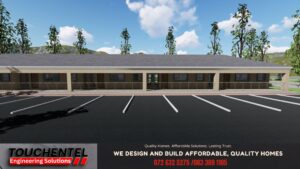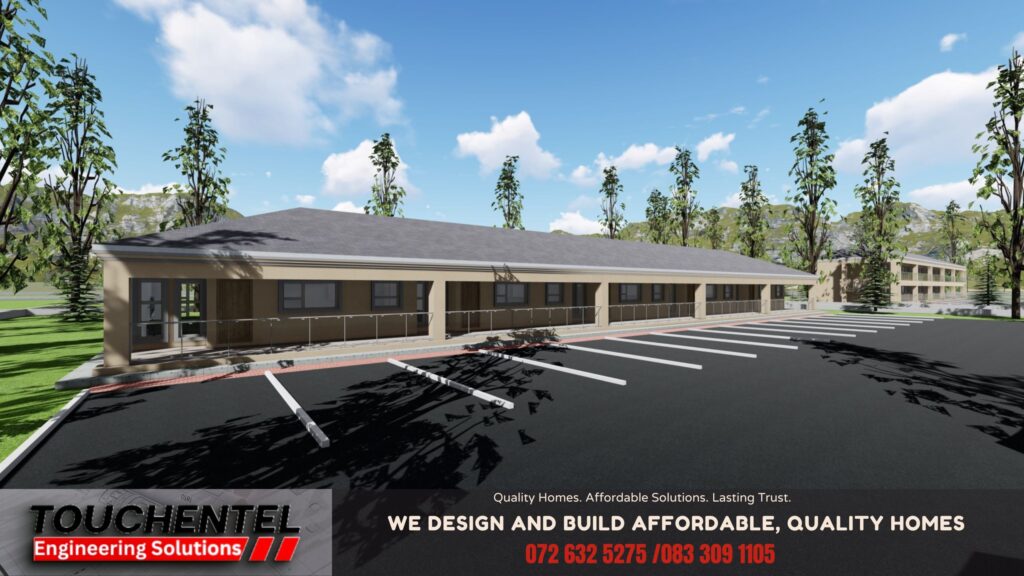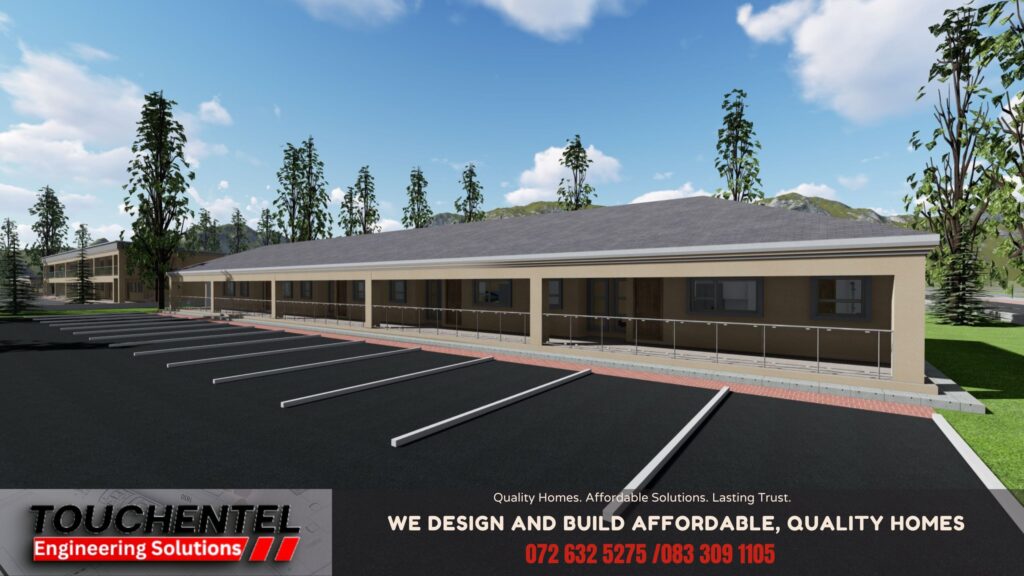A thoughtfully designed residential development offering affordable, high-quality 1-bedroom homes within a well-planned and secure environment. The project combines smart space planning, modern design, and durable construction to create comfortable, long-lasting homes. Architectural Description This development features a row of efficiently designed single-storey units arranged within a clean, organized site layout. The design prioritizes functionality, privacy, and natural light while maintaining a cohesive architectural identity across all units. Each home is self-contained and positioned to create a strong sense of community while ensuring individual comfort. Exterior Design The exterior reflects a modern, minimal aesthetic with: The long shaded walkway enhances protection from weather while creating visual rhythm along the elevation. Floor Plan & Spatial Organization Each home includes: The layout maximizes space efficiency, allowing seamless flow between living and kitchen areas while maintaining privacy for the bedroom and bathroom. Elevation & Roof Design The development features: The roof form enhances durability while contributing to the clean, contemporary look. Materials & Finishes Selected for affordability, durability, and low maintenance: The material palette ensures long-term value and minimal upkeep. Architectural Character The project presents a modern, practical, and community-focused housing solution. Its simplicity, efficiency, and clean design make it ideal for first-time homeowners, small families, or rental investment opportunities.